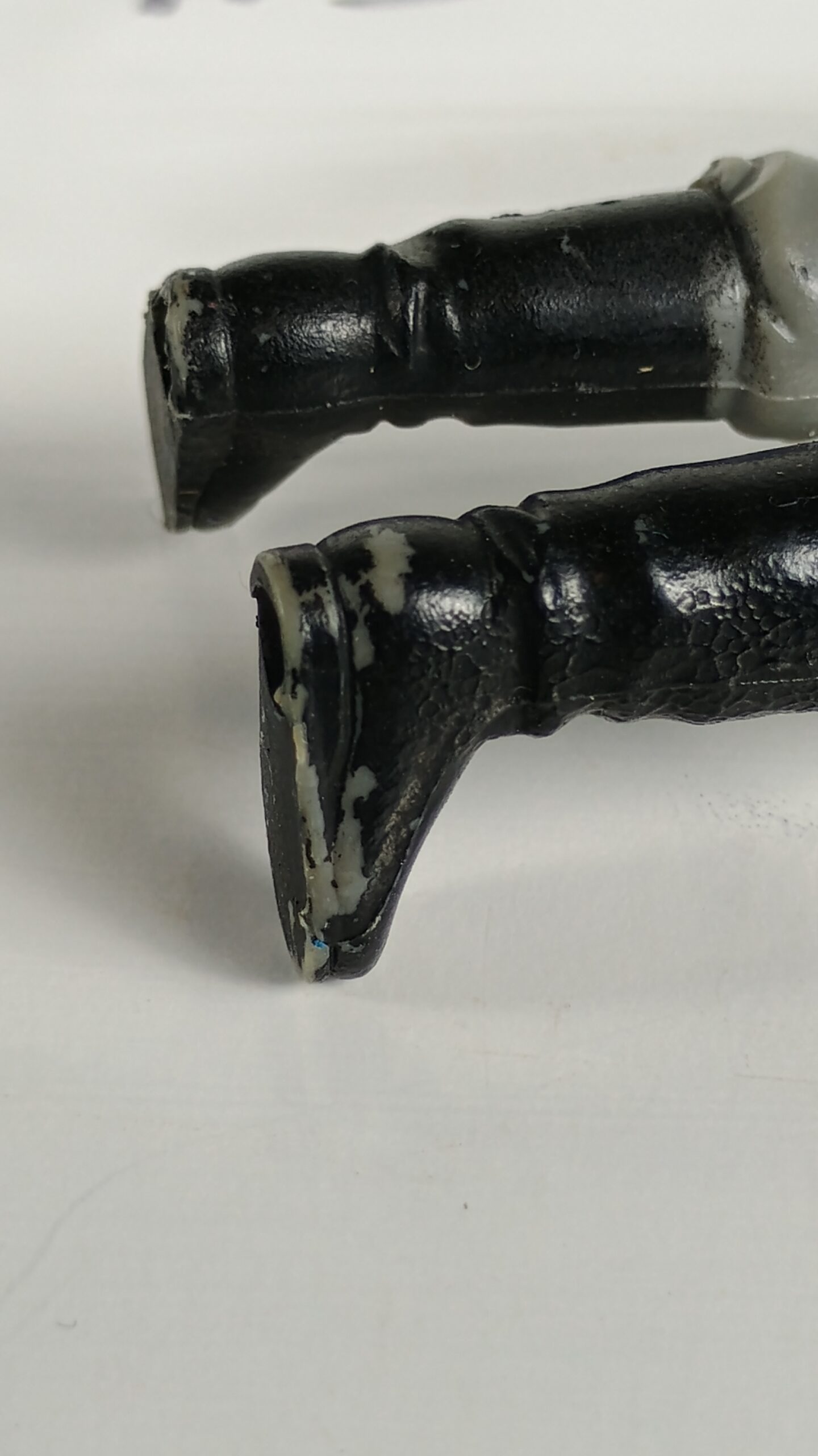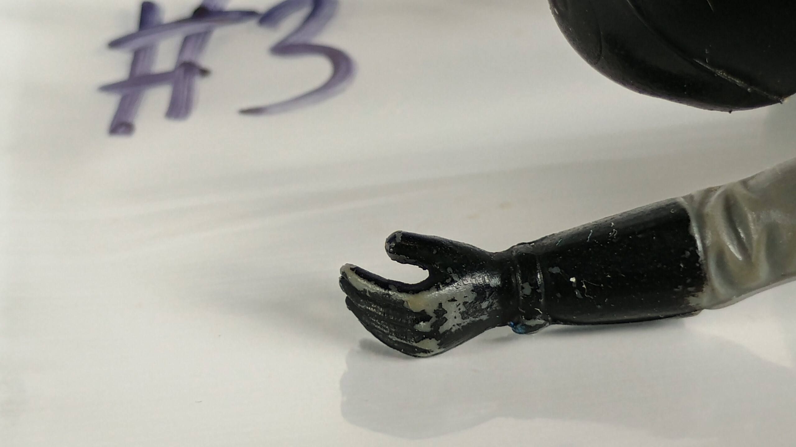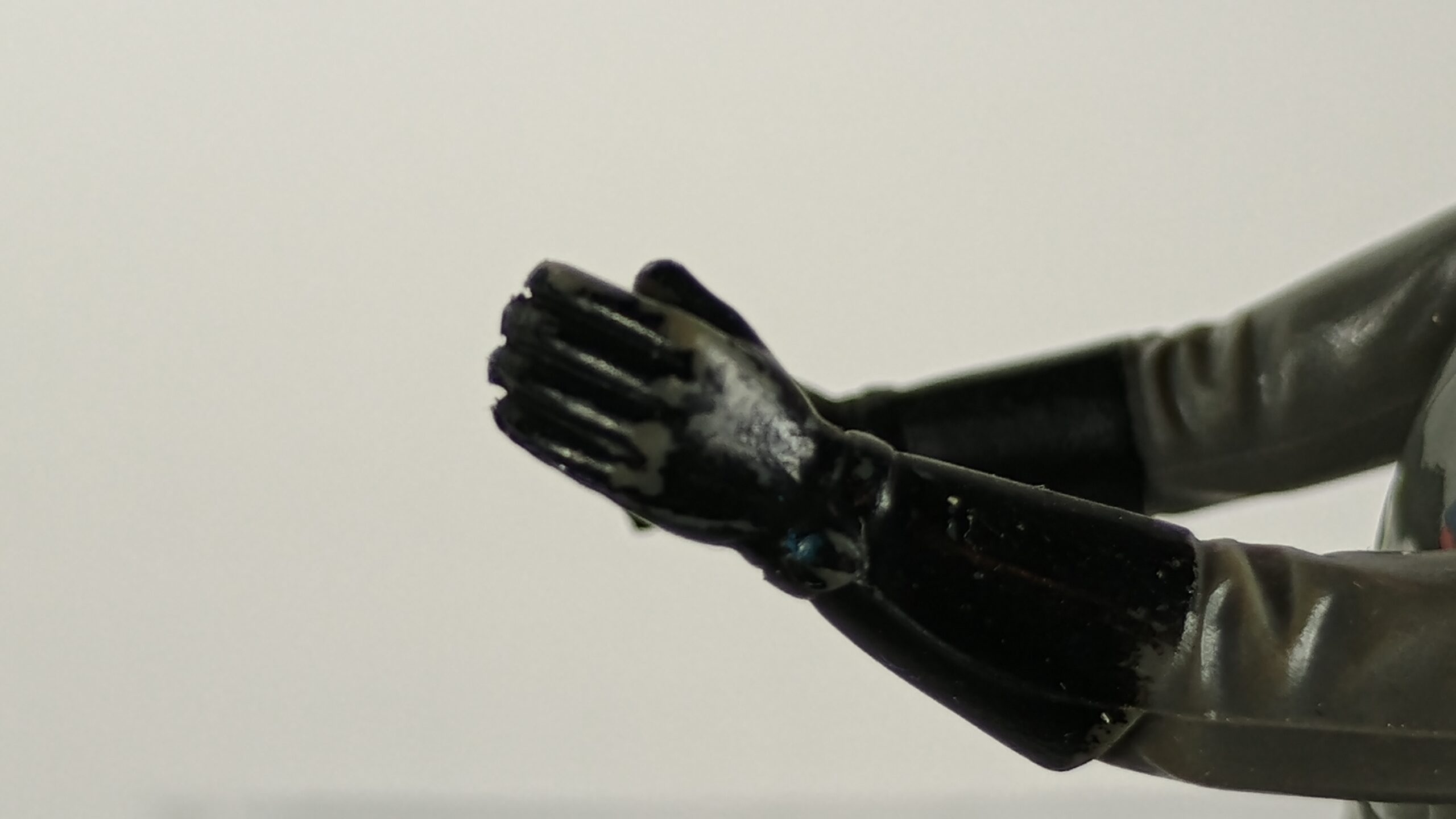This figure is in good condition, with a potential caveat. This figure was one of my favorites (frankly, I’m not sure why, but he was) so I had a bunch of them and a tendency to touch him up whenever he was looking a little worn. Problem is, I’m not 100% sure which ones I touched up and which ones I didn’t. I would use Testors model paint, which, for some reason, on some figures, would never dry (even to this day some figures are still tacky). That said, the paint on this figure is good and solid, so we can’t use that as a clue. I did pull one DSC from my listings because his helmet was most obviously painted. In light of the fact that the helmet, gloves, and boots are scuffed, and no silver circles on his wrist, I would be inclined to think that I did not touch this one up.