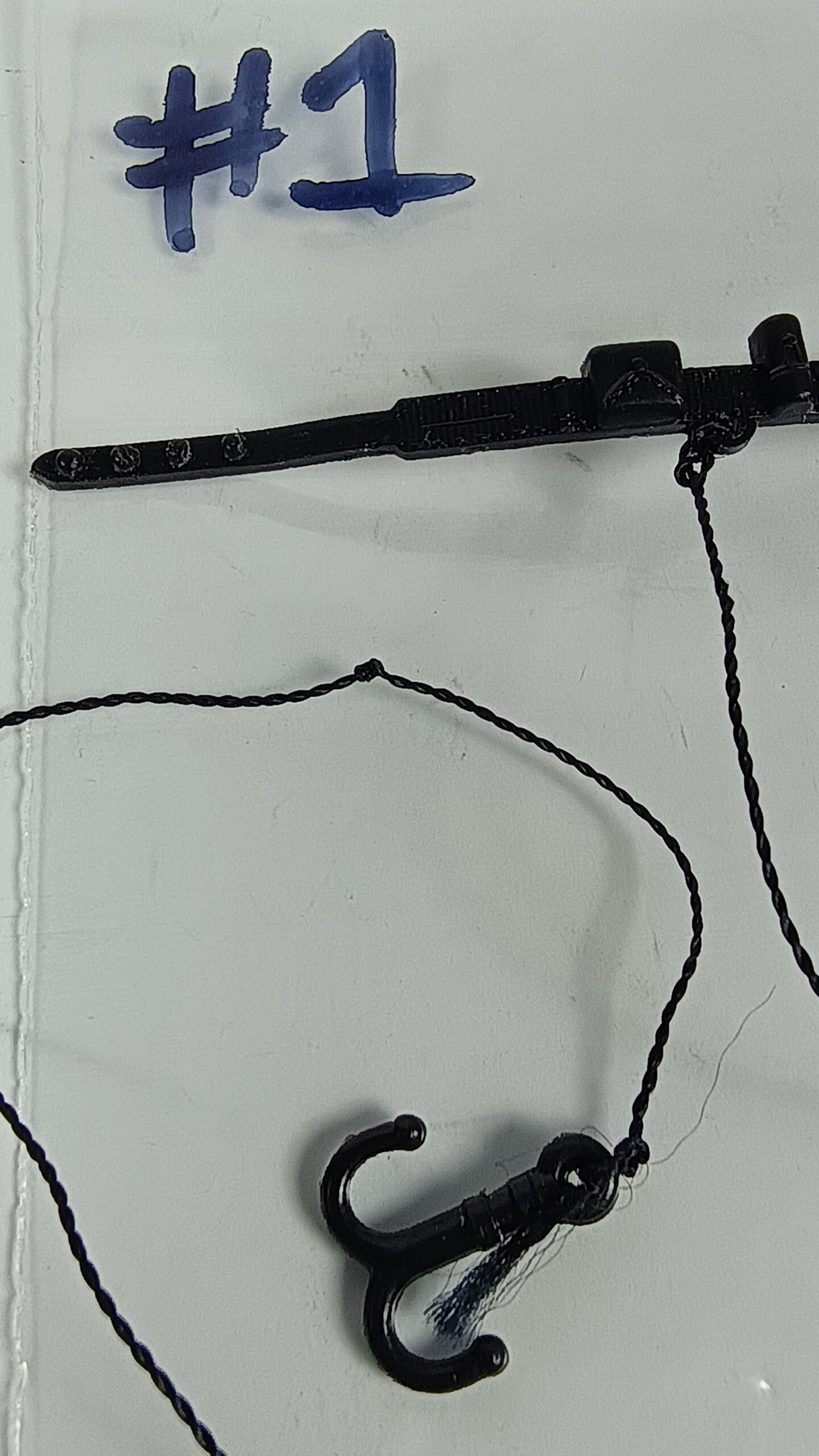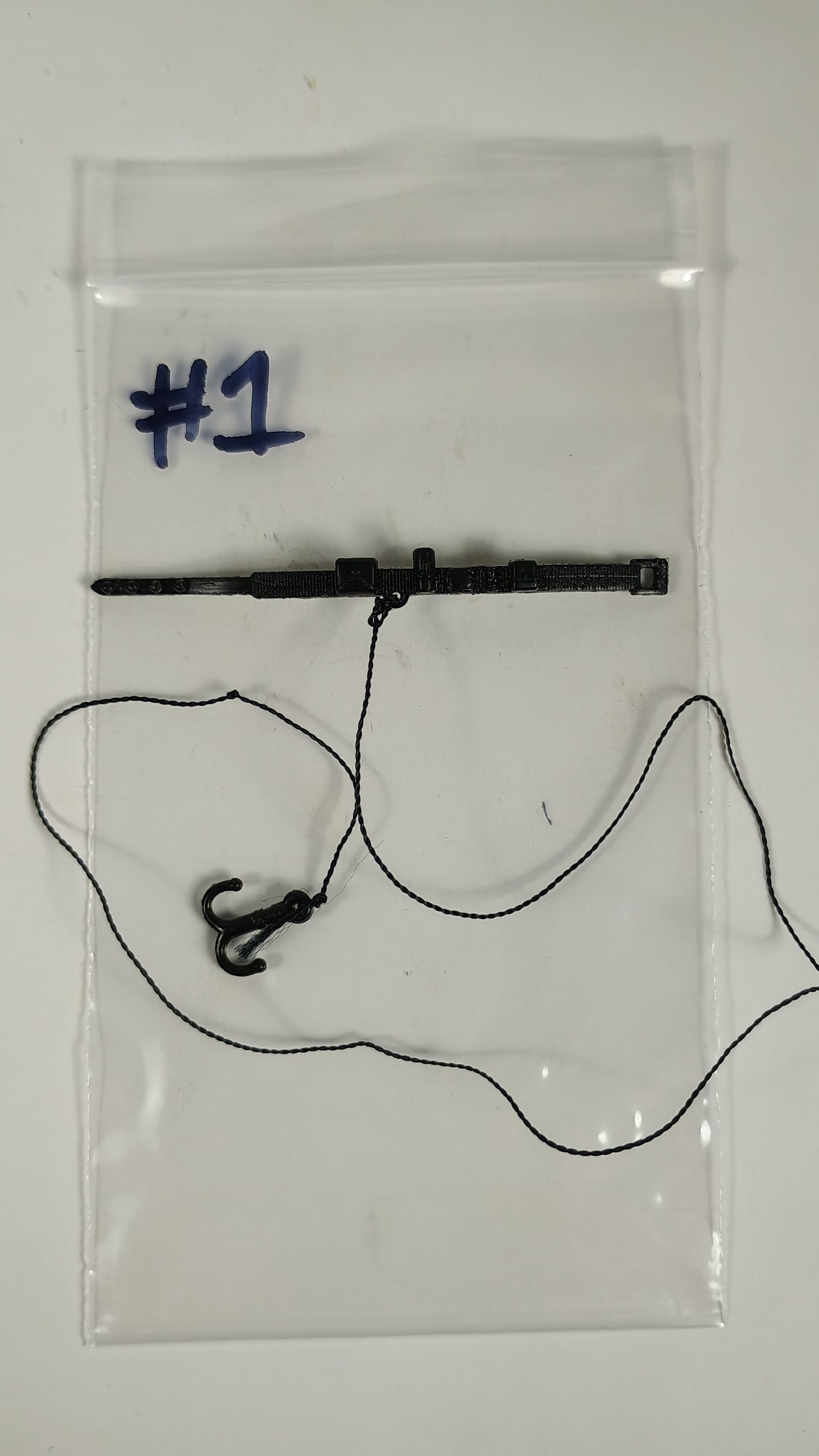 This is an authentic, original Kenner Grappling Hook And Belt Survival Kit Accessory from the vintage Star Wars 3.75″ figure line, used in Star Wars and Empire Strikes Back. Only one Grappling Hook And Belt (#1) is being sold in this listing. The string has a knot in it. I’m not brave enough to try to untangle it, so I’ll leave that to the lucky buyer.