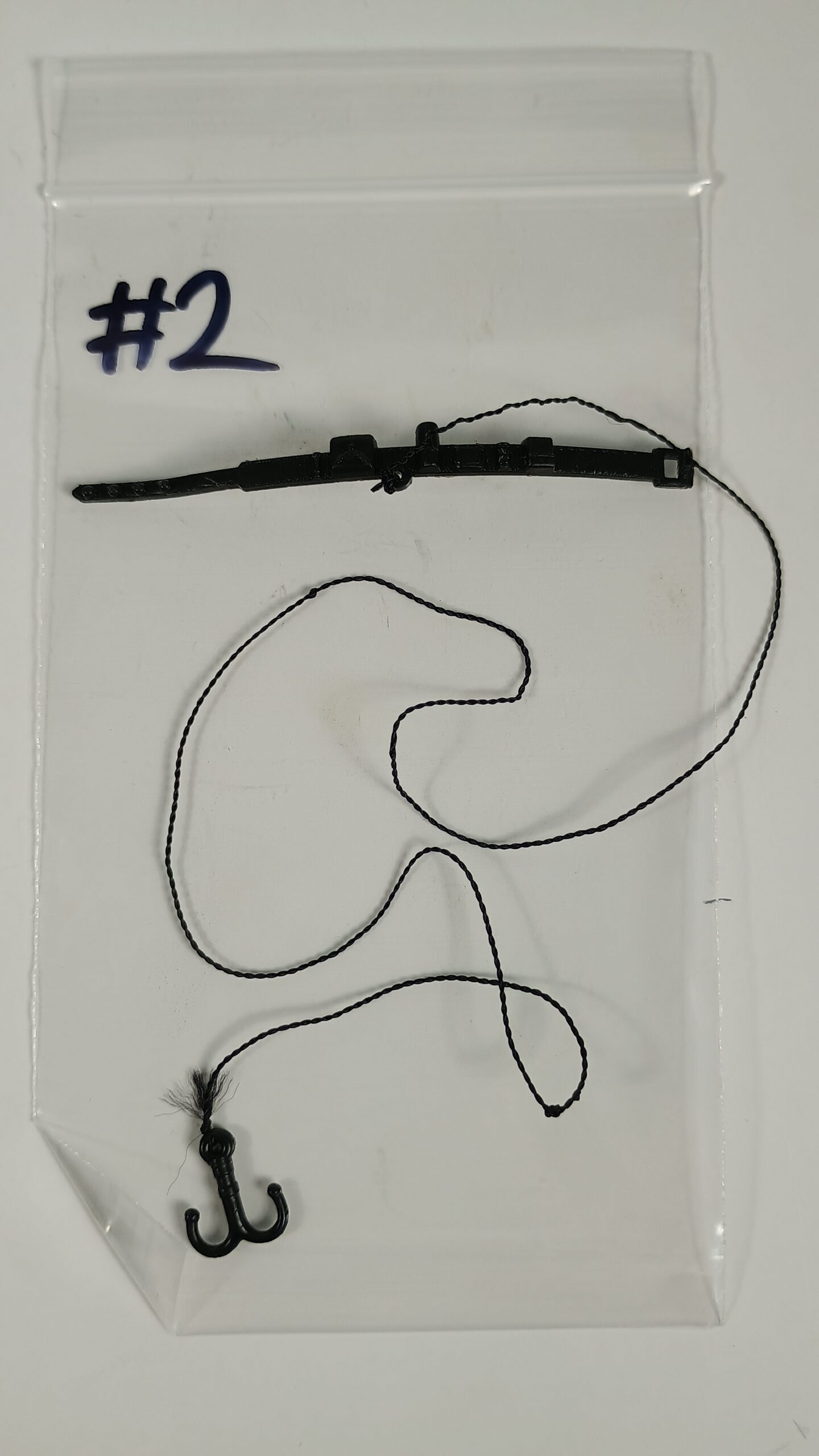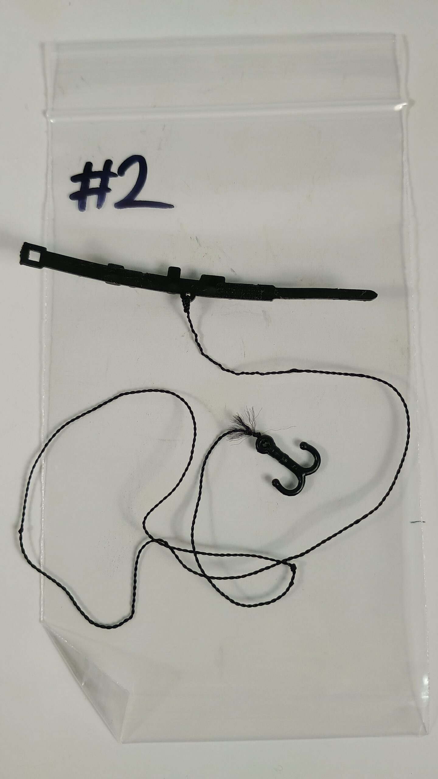 This is an authentic, original Kenner Grappling Hook And Belt Survival Kit Accessory from the vintage Star Wars 3.75″ figure line, used in Star Wars and Empire Strikes Back. Only one Grappling Hook And Belt (#2) is being sold in this listing. The string has two knots in it. I’m not brave enough to try to untangle them, so I’ll leave that to the lucky buyer.